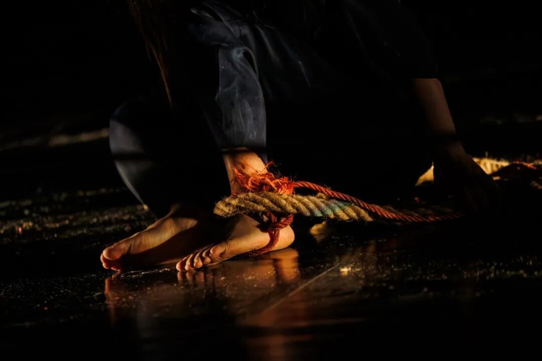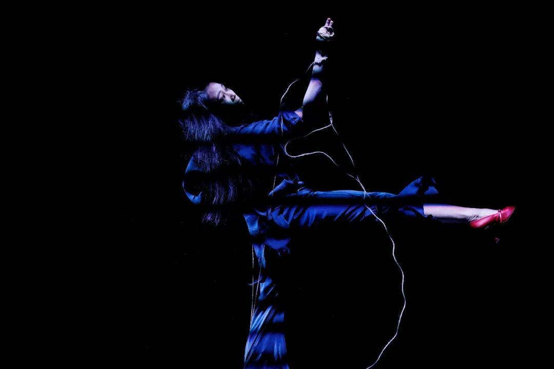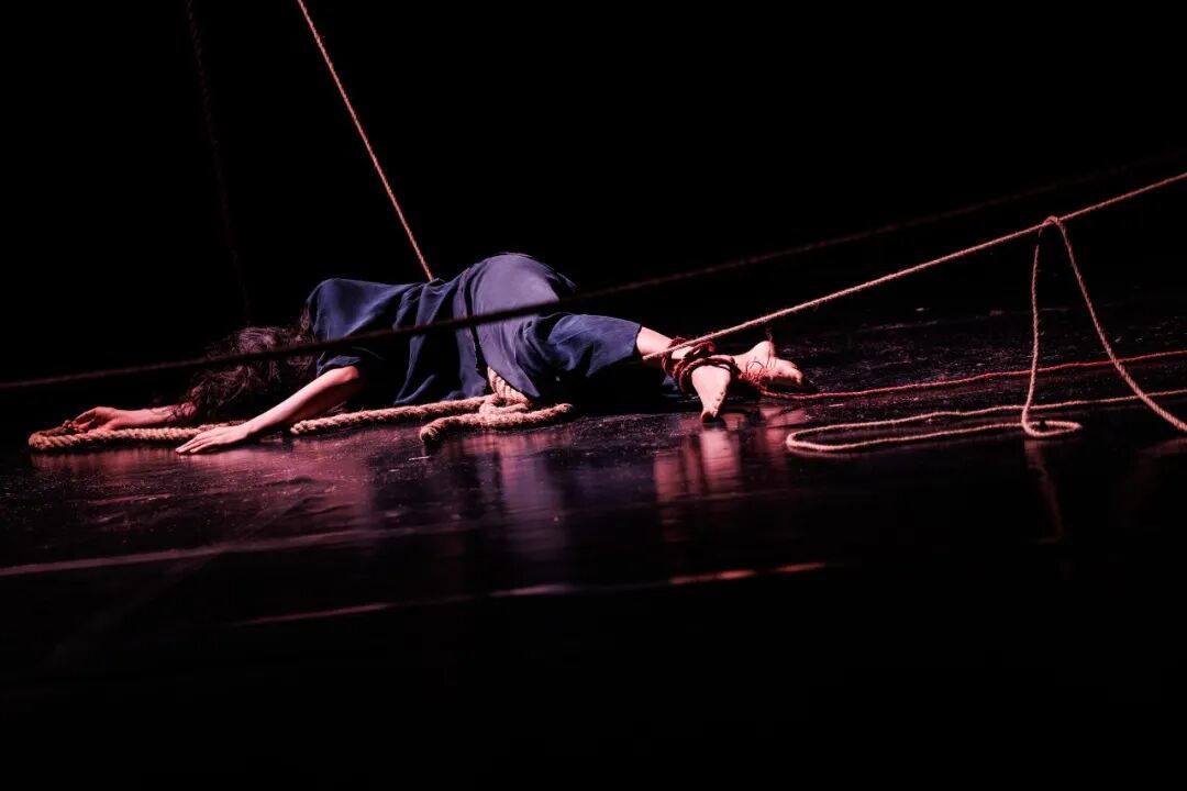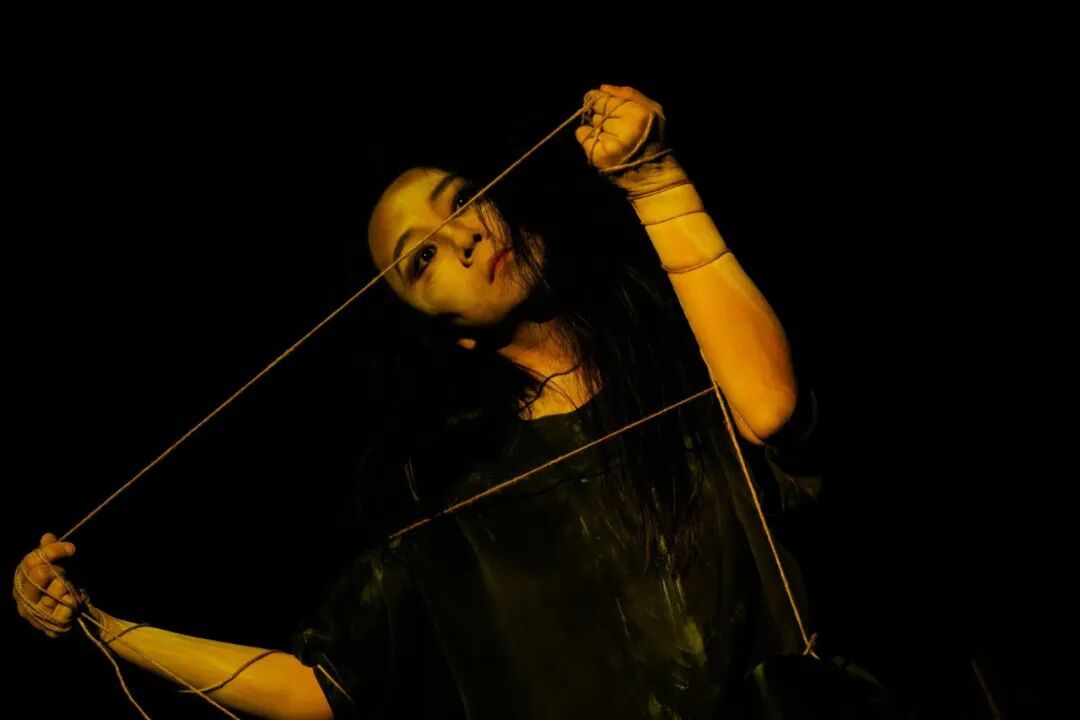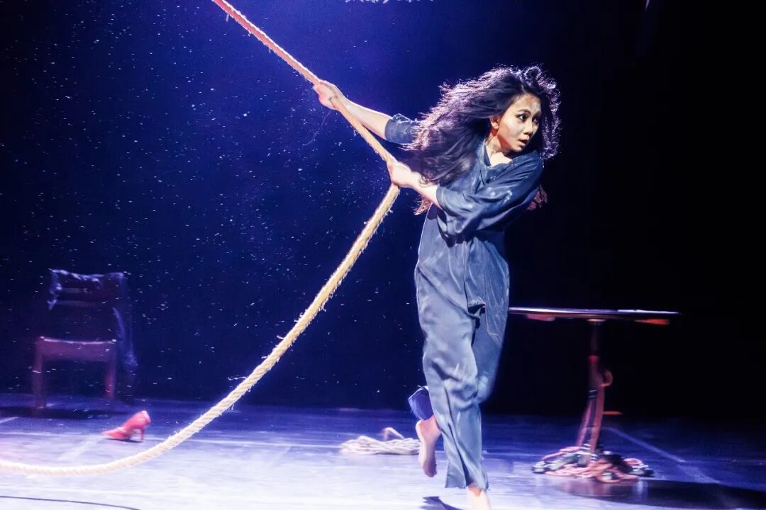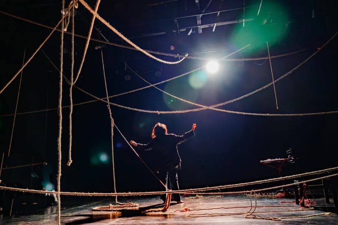 这部作品的舞台陈设很简单,只有一张桌子和一把椅子,另有许多高低错落的麻绳从剧场的各个角落蔓延至舞台上,所有观众都被笼罩在这张网里,无处遁形。从走进剧场的那一刻起,观众就和演出者形成了一个共同体。薛佳出场时一只脚穿着颜色鲜红如血的高跟鞋,另一只赤脚则高高踮起,她向前迈出的每一步都十分艰难,仿佛在泥泞的沼泽中跋涉。