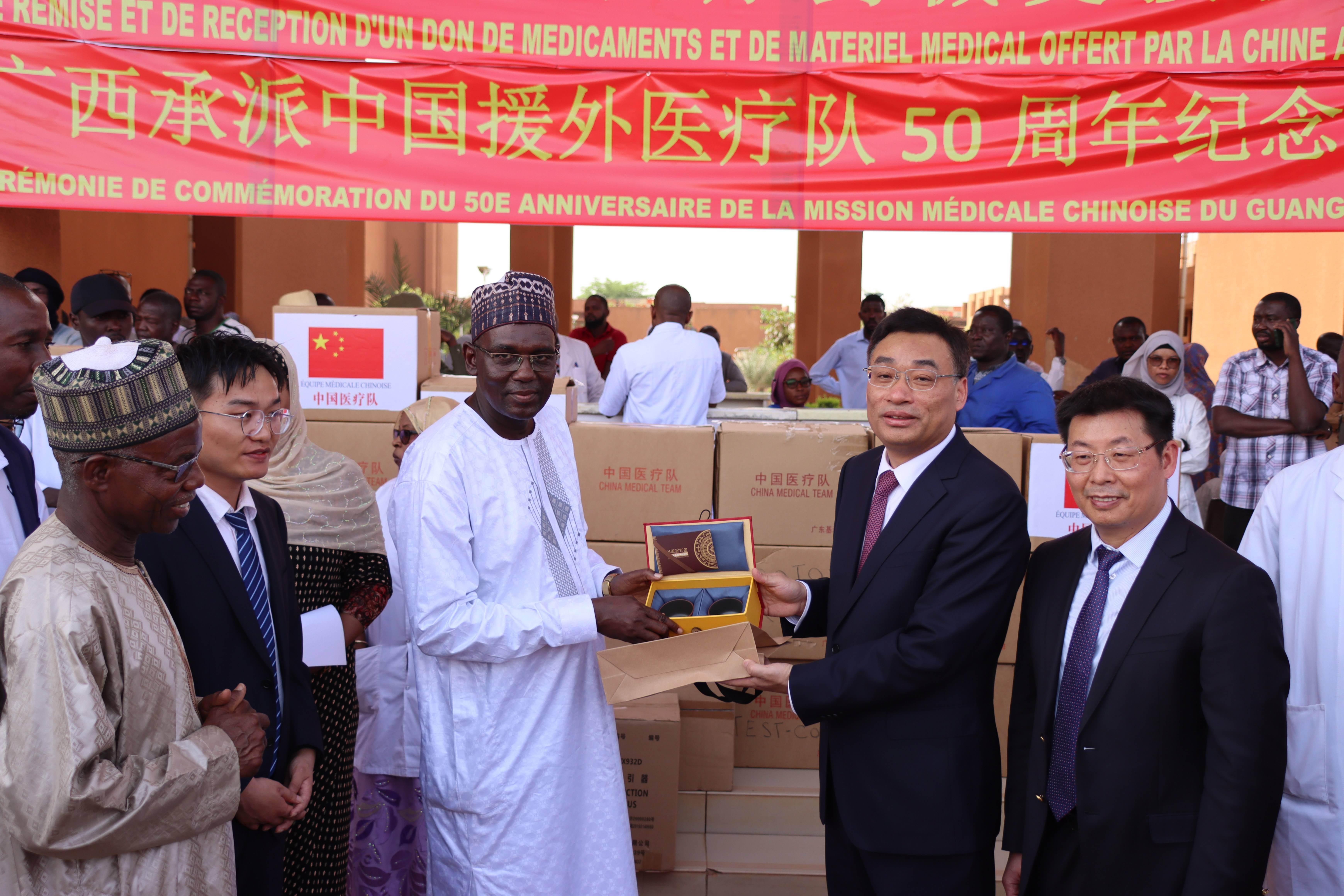 3月25日,在尼日尔首都尼亚美举办的中国援尼日尔医疗队50周年纪念活动上,广西壮族自治区卫生健康委员会党组书记、主任杜振宗(右二)与尼日尔综合示范医院院长马马内·达乌(右三)互赠纪念品。新华社发(中国第25批援尼日尔医疗队供图)中国驻尼日尔大使律桂军,广西壮族自治区卫生健康委员会党组书记、主任杜振宗率广西卫生健康代表团,尼日尔公共卫生与健康部长加尔巴·哈基米上校、尼日尔综合示范医院院长马马内·达乌等尼方政要及医护人员代表,世界卫生组织驻尼日尔代表处人员,中资机构和华侨华人代表以及中国第25批援尼日尔医疗队全体队员参加活动。